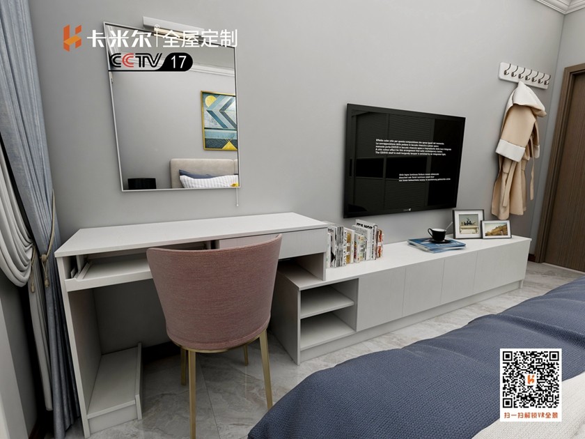 臥室電視柜由地柜+書桌組合可以擺放臺燈、相框、飾品,柜里則可以塞進大摞的書籍和生活用品。